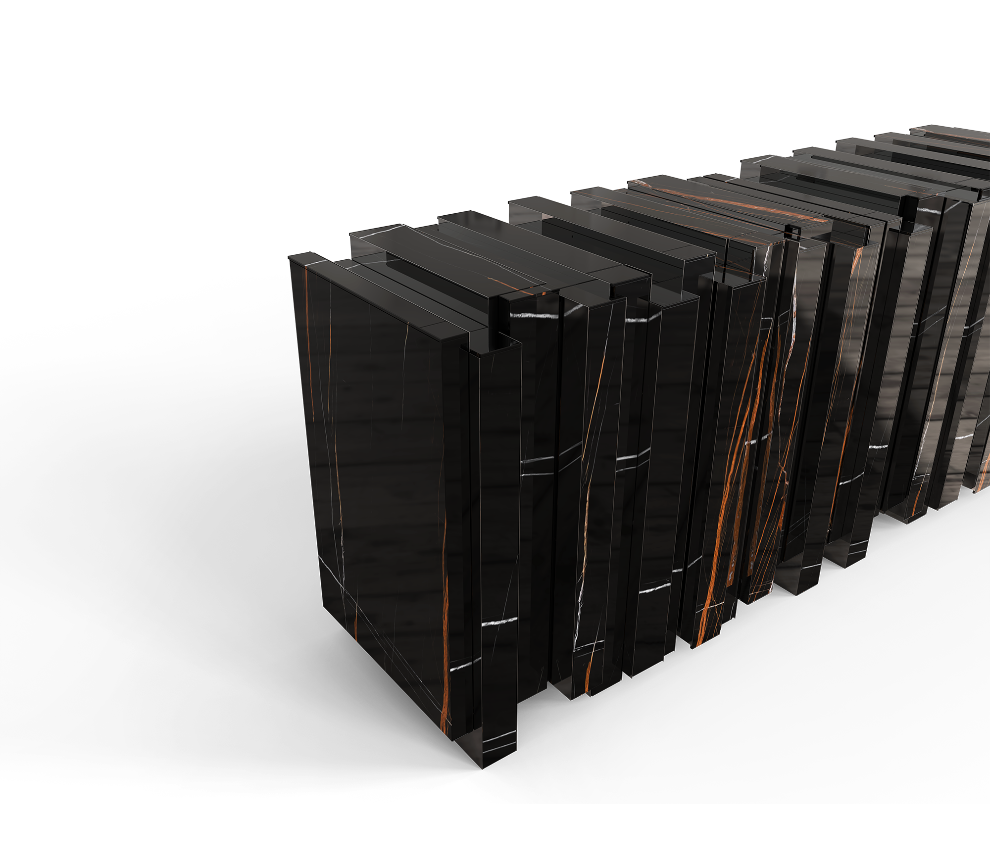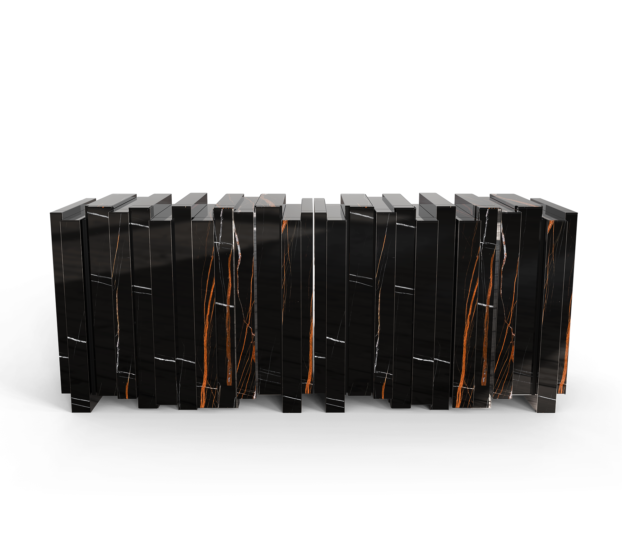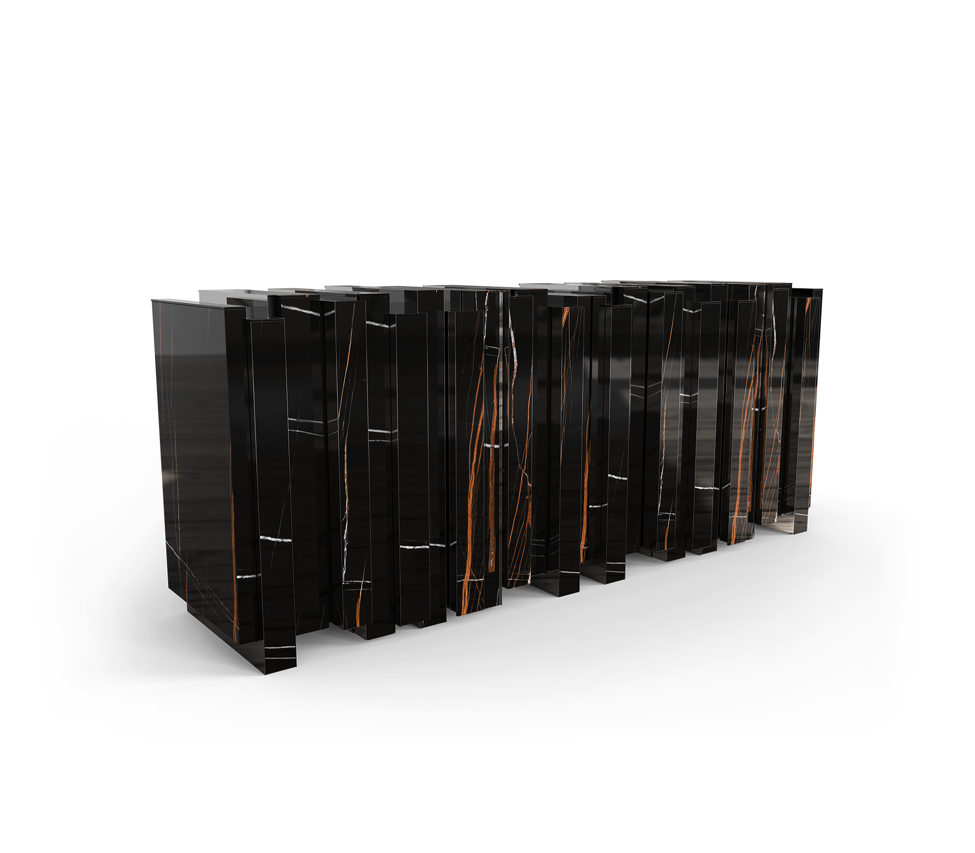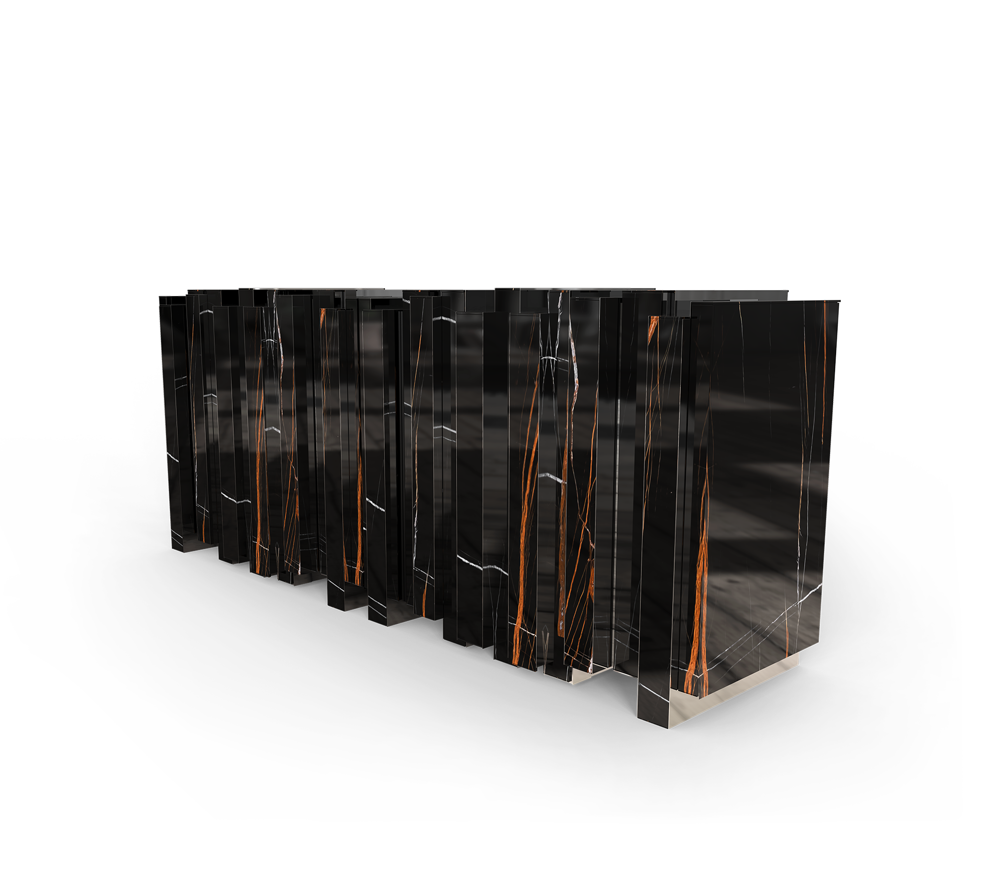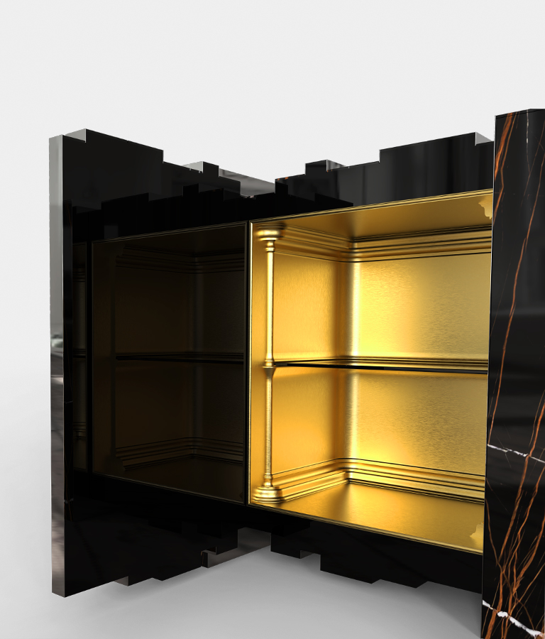 Vertigo sideboard is the perfect union of art and functionality. The the luxurious design is accentuated by slabs of Sahara Noir marble, which add a touch of sophistication and exclusivity. The golden mirror adds an extra dimension of depth and elegance, reflecting the beauty of the surrounding environment. With four doors the sideboard reveals a meticulously detailed interior, including two gold glass shelves. Every element, from the veneering to the stone and glass work, has been carefully executed to ensure an impeccable finish. A design that combines luxury and practicality, making it the perfect highlight for any refined setting.