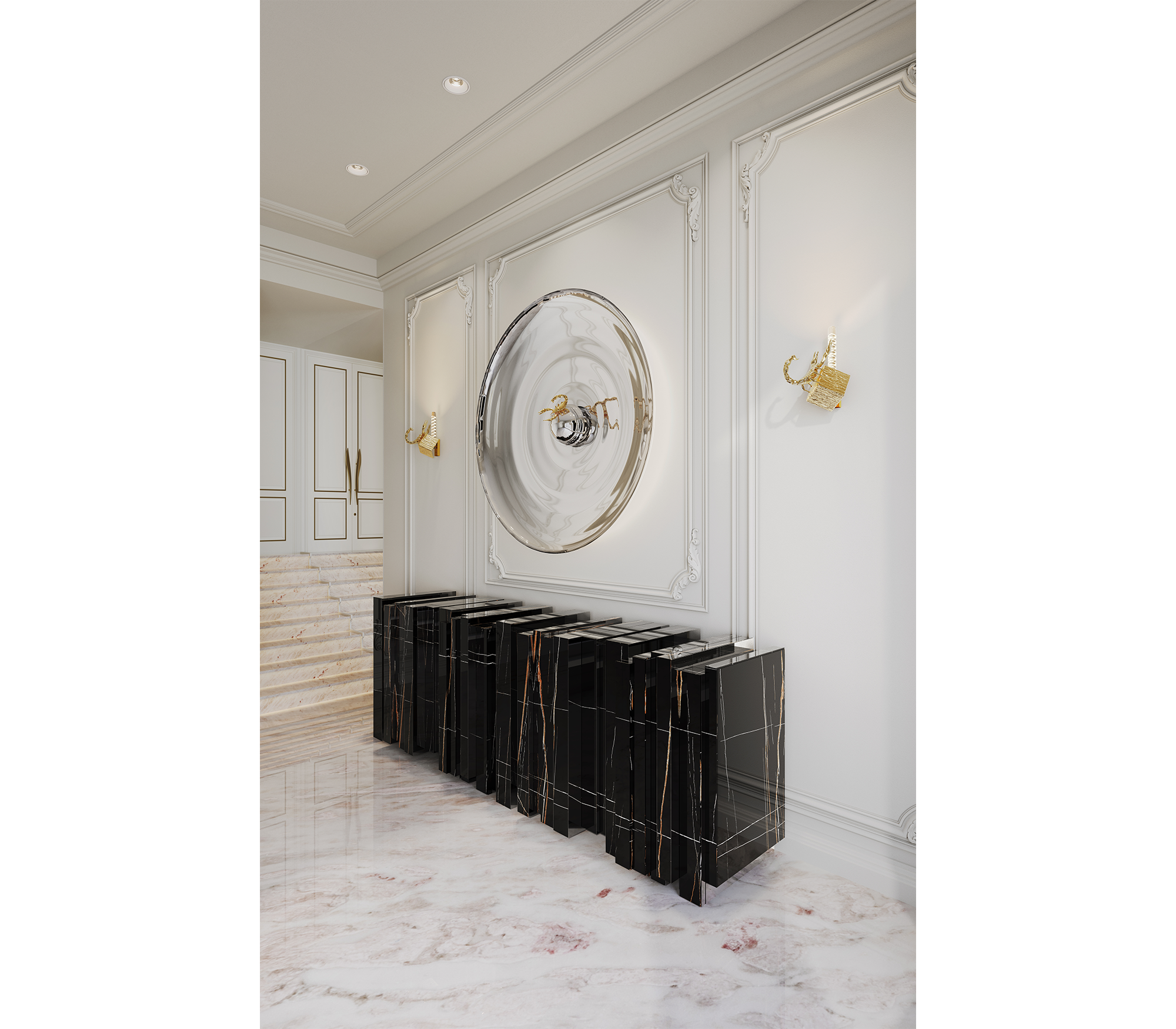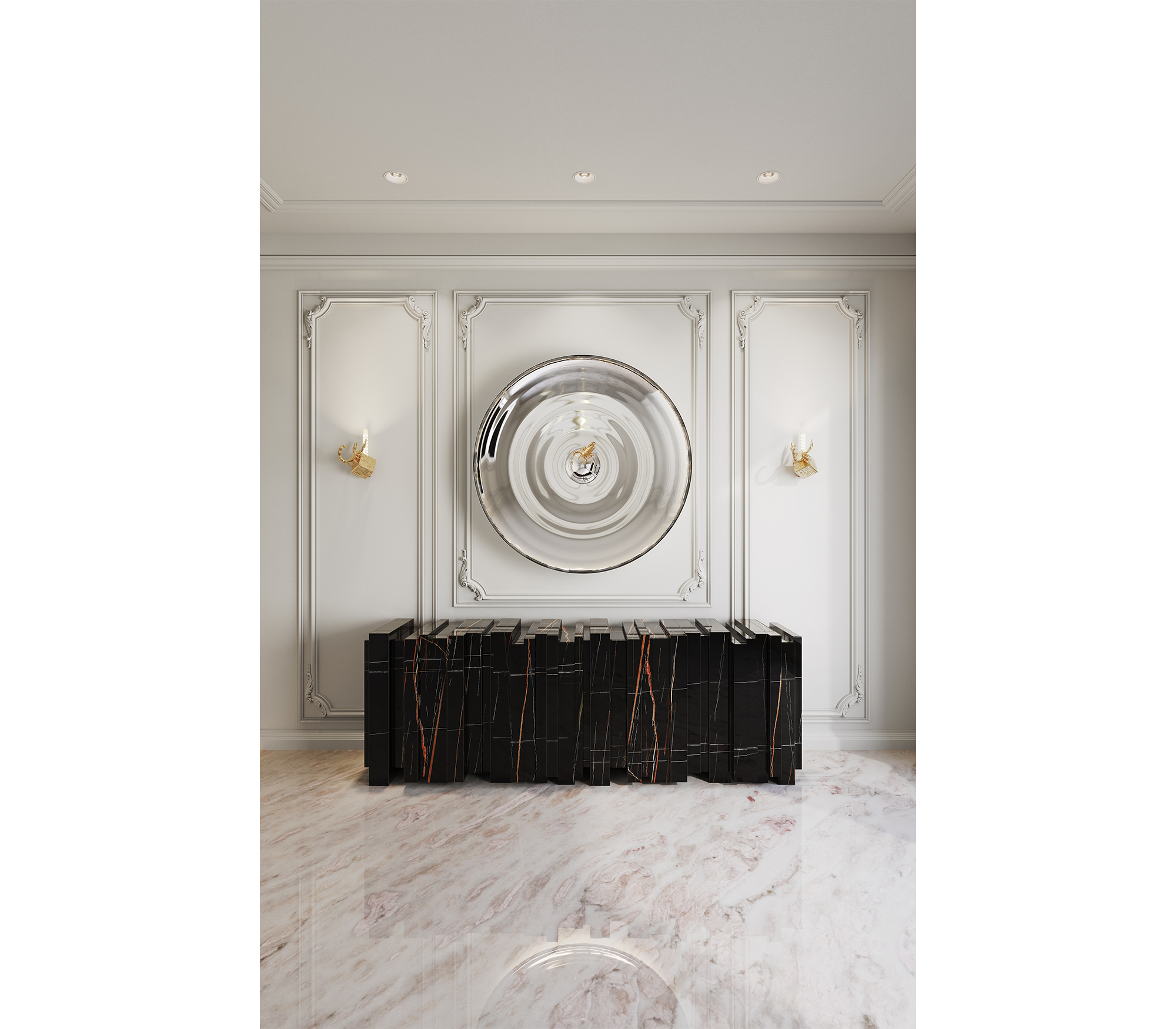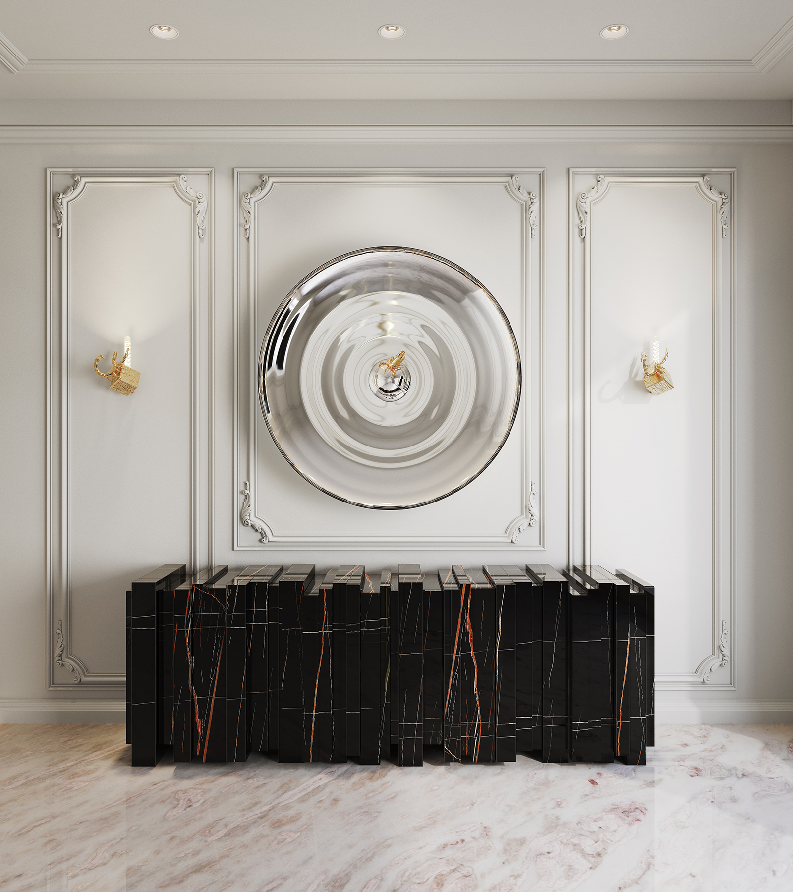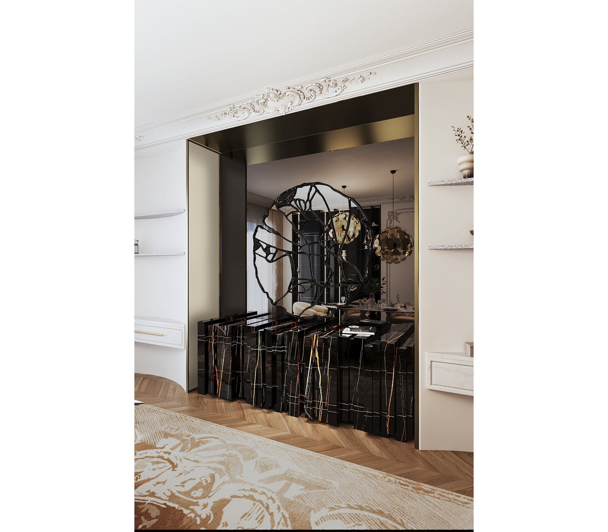 Sahara Noir Marble, Gold Mirror, Gold Glass, Black Lacquer and