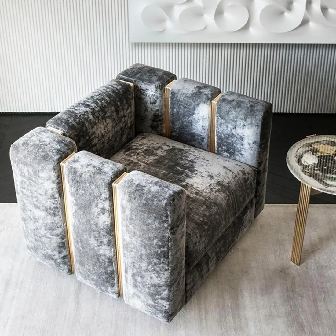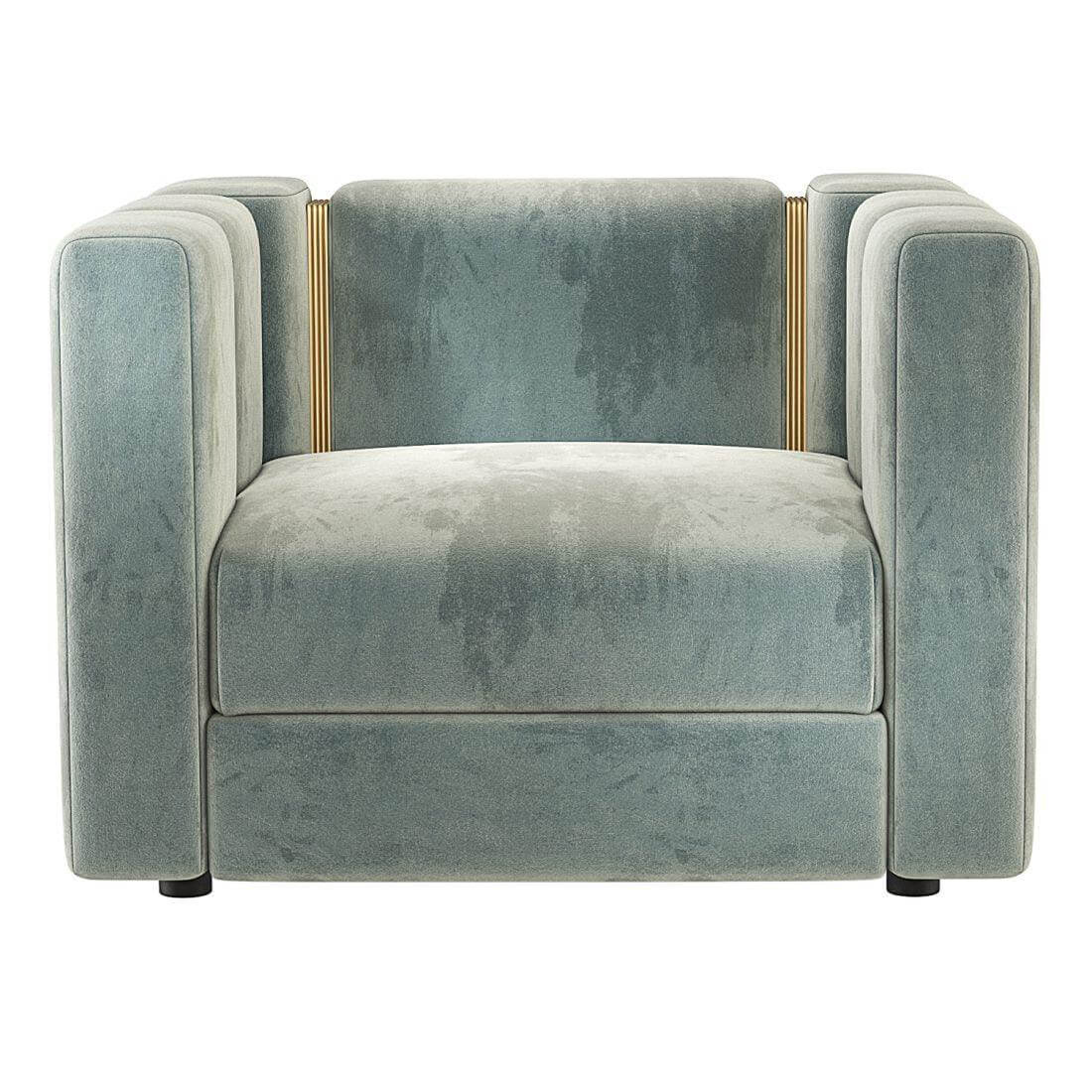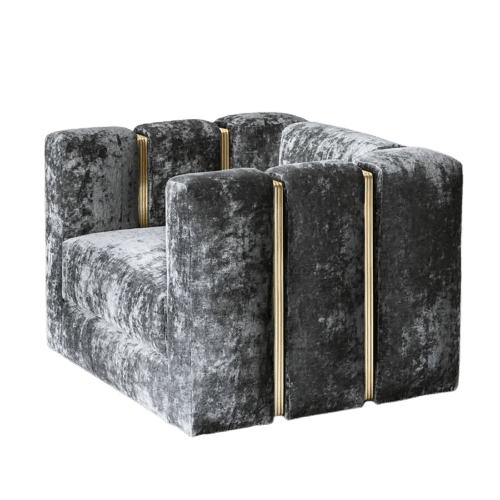 Armchair Virginia with solid wood structure, upholstered and covered with Essex high quality silver crushed velvet fabric. With polished brass finish stripe hardware.