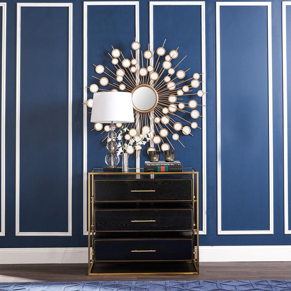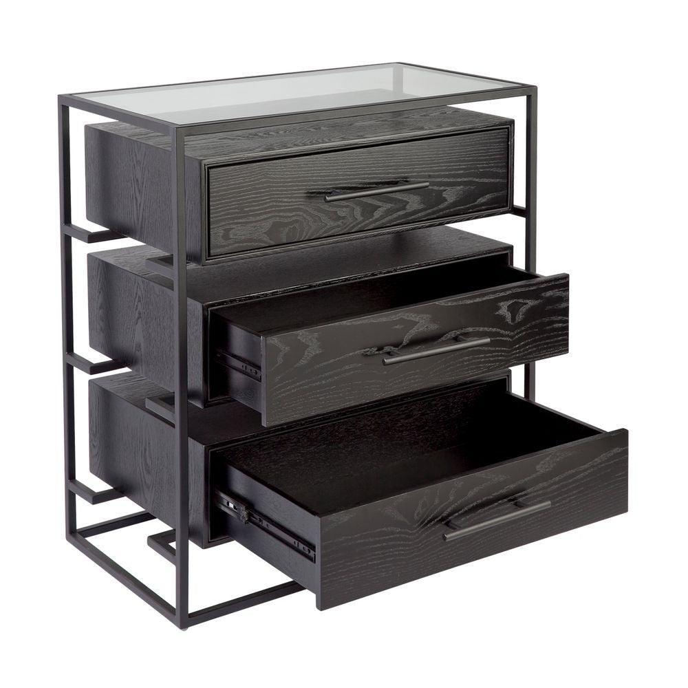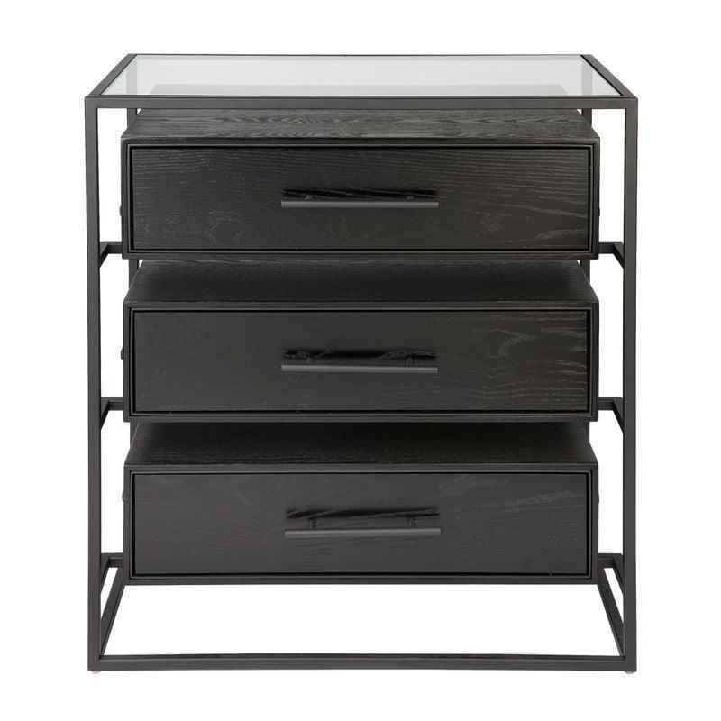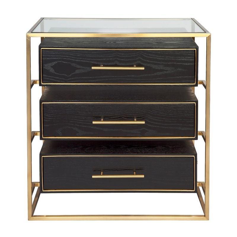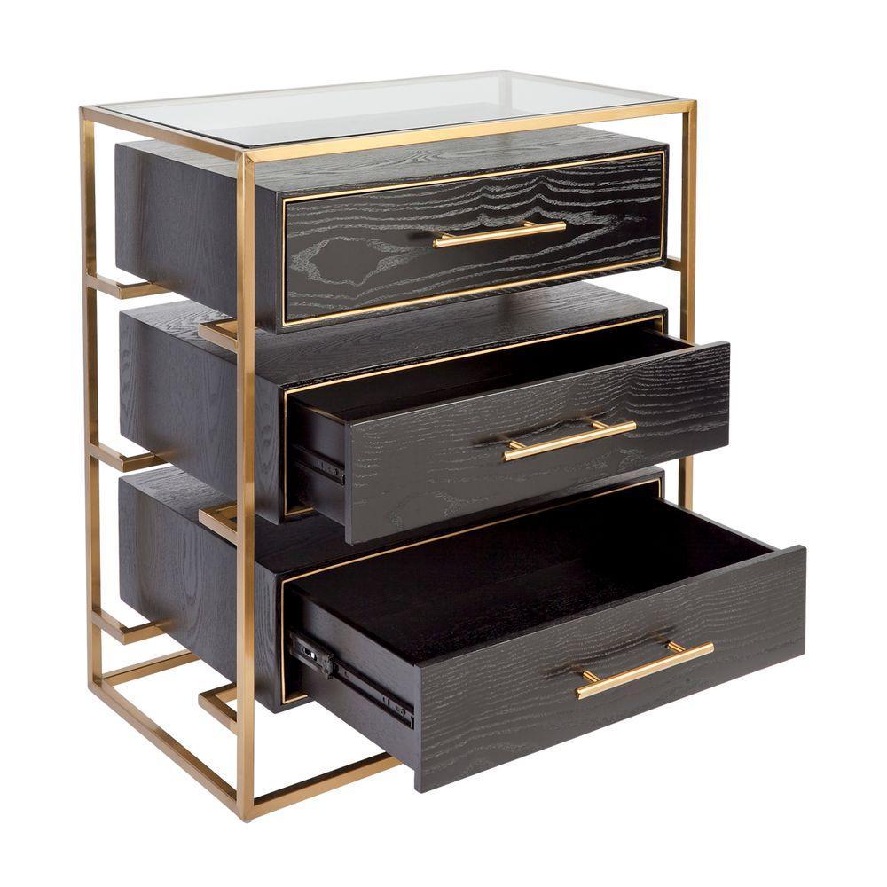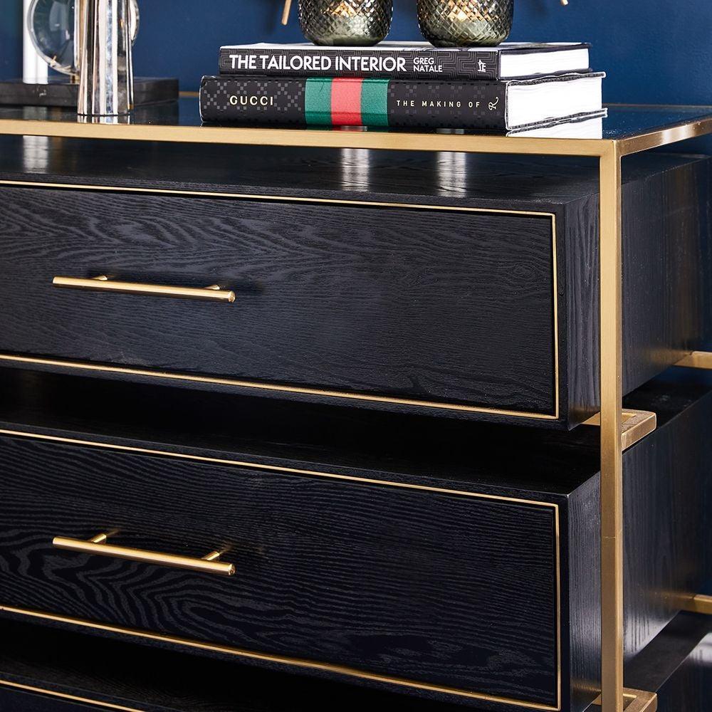 Sleek, sexy and perfectly proportioned, our Vogue range hits all the right notes. Crafted in a black ash floating within a glamorously brushed gold stainless steel frame and tempered glass top, these quality designer pieces you will truly fall in love with. This unique three drawer chest of drawers brings functional storage and mid-century style to your living room or bedroom with its silhouette shape. Care Instructions: Wipe down regularly using damp cloth. Dry thoroughly.