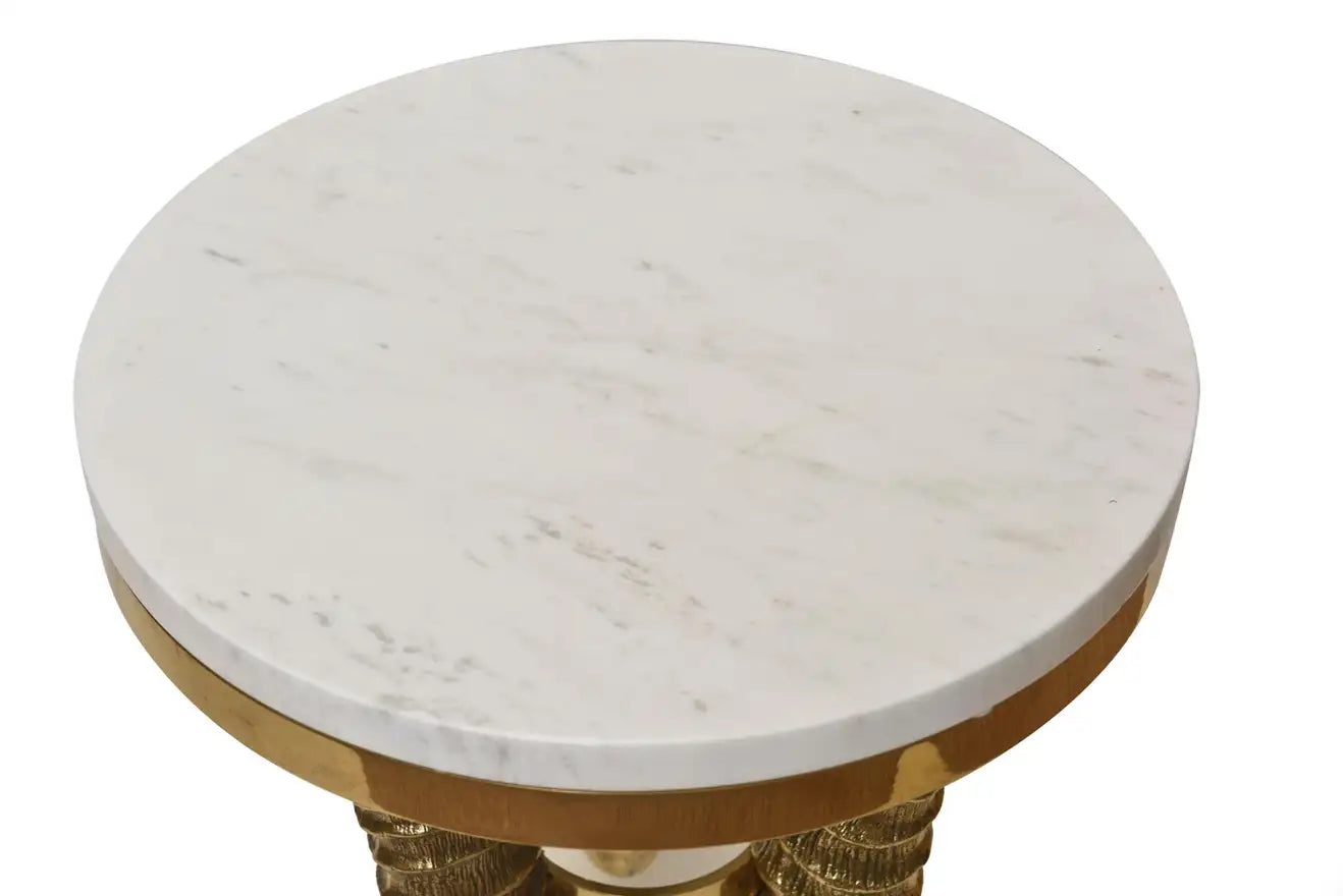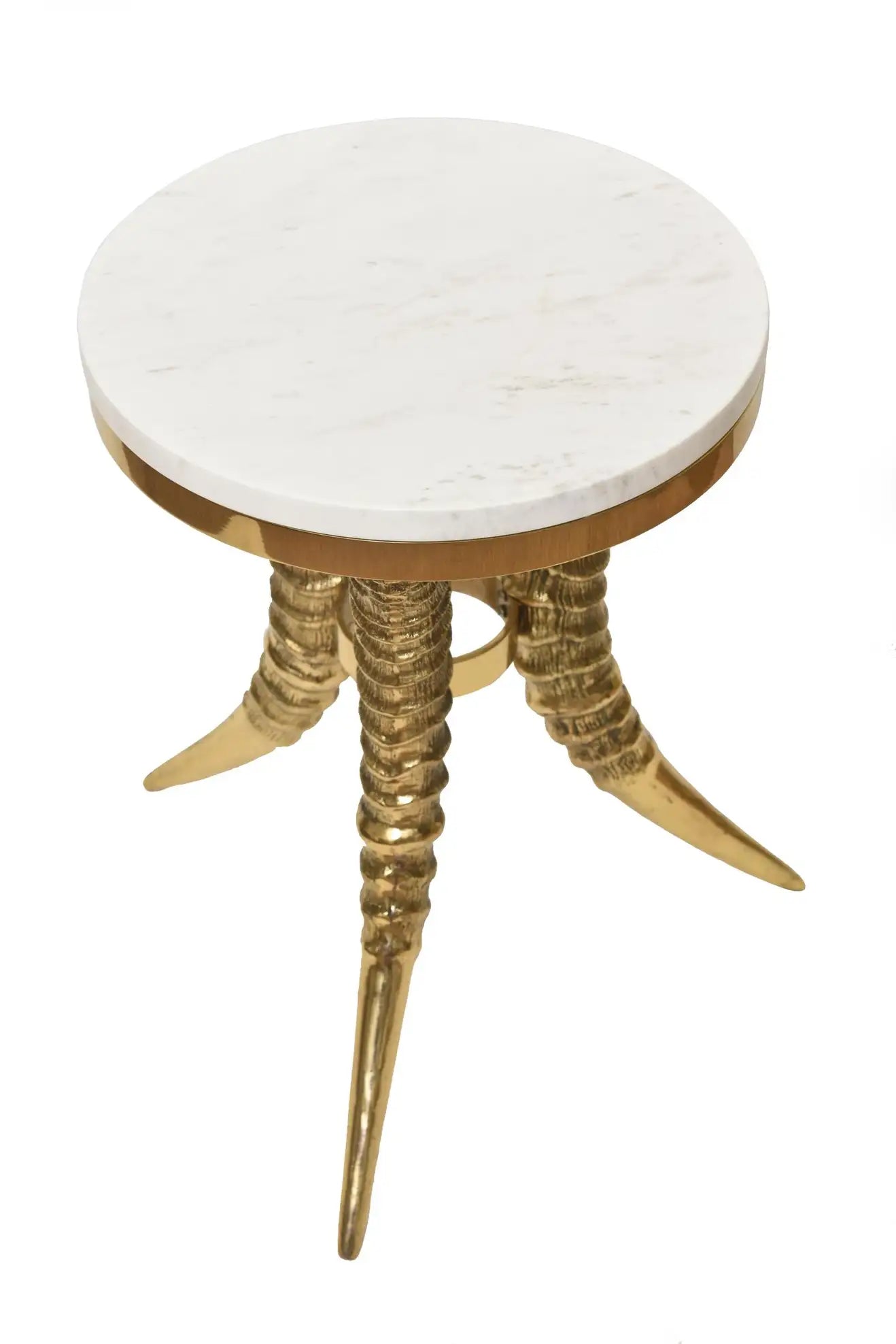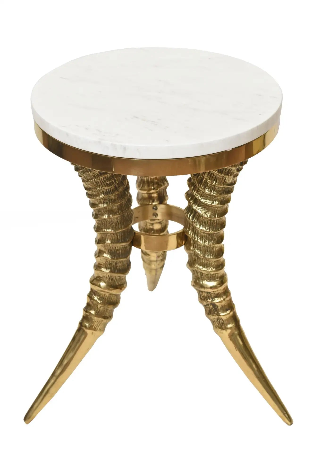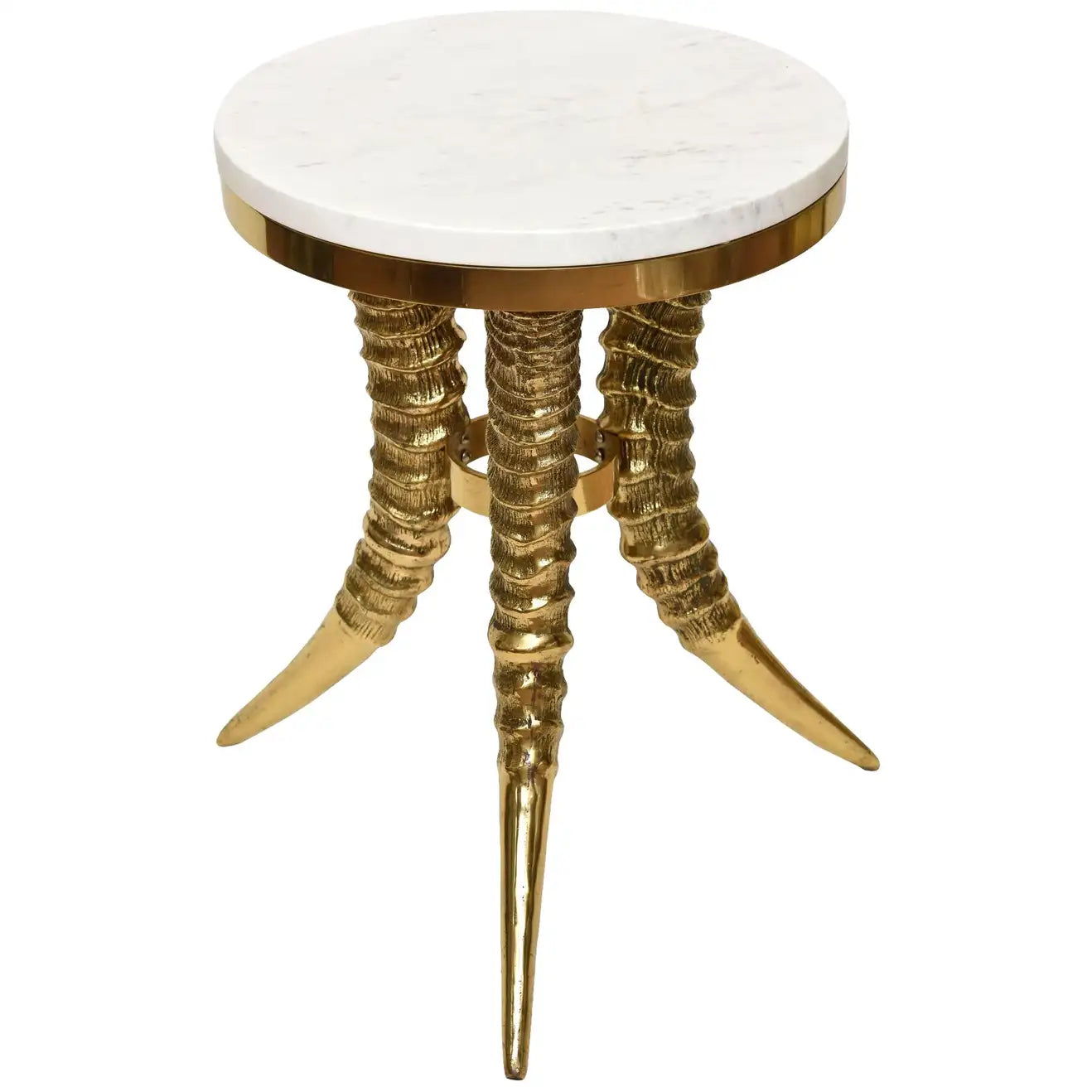 This fantastic marble and brass horn side or drink table with a marble top is tres chic! The marble top was replaced and is called Volakas marble from Greece. It has beautiful veining of grey and champagne with white. It is sculptural and unusual side table with good weight. The curved horn shaped 3 legs add great dimension and are textural. They are held together with a brass ring. This can go into any decor and room for a conversation addition. It is very well made and from the 1970s. The depth of the curved table legs from front to back is 17.5″.