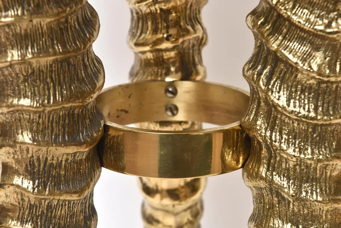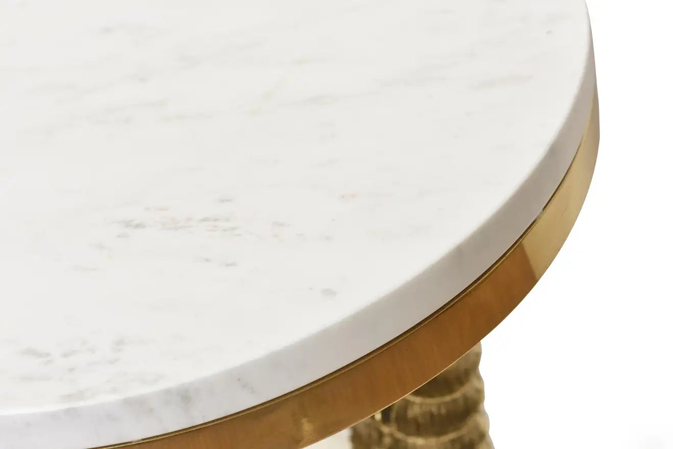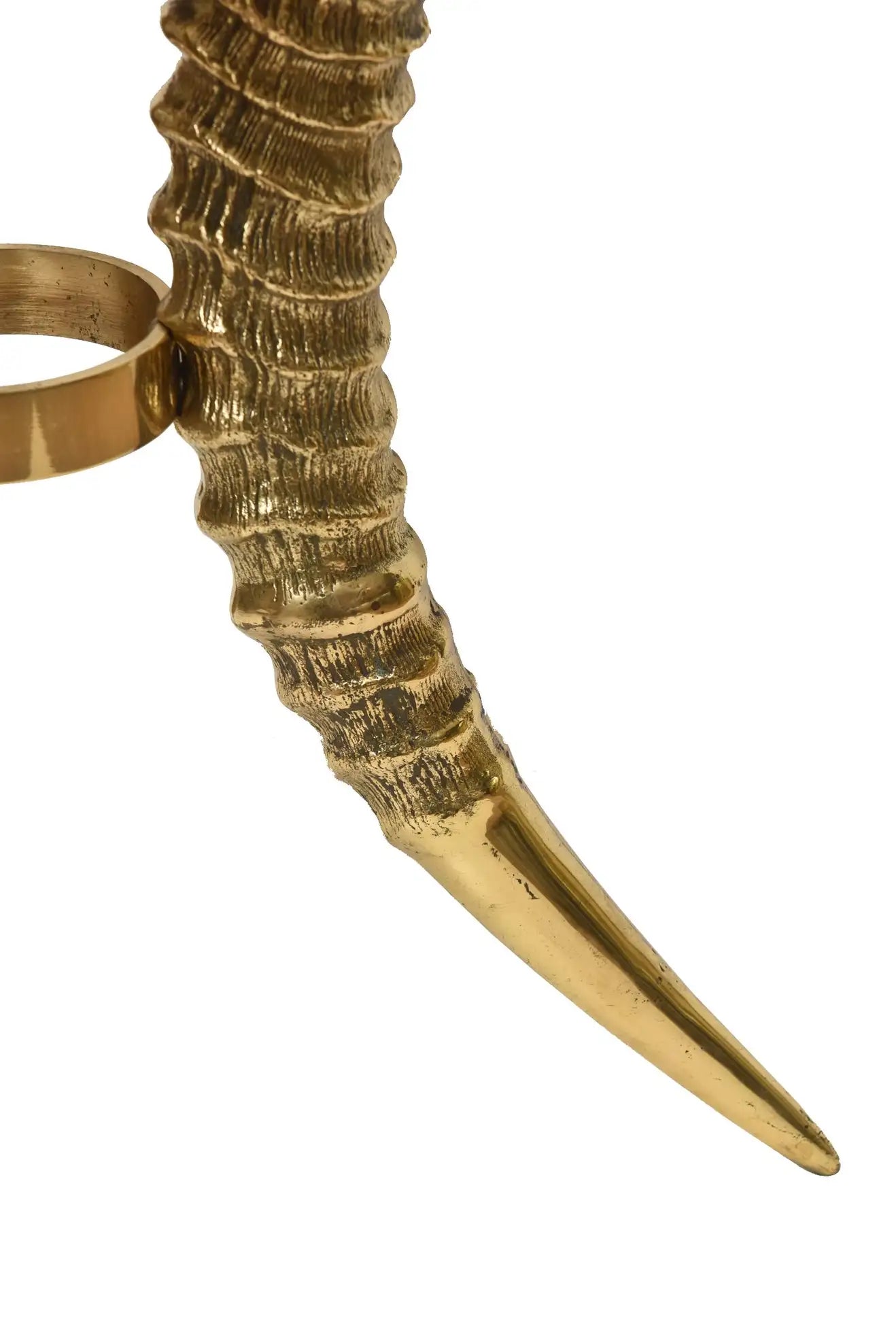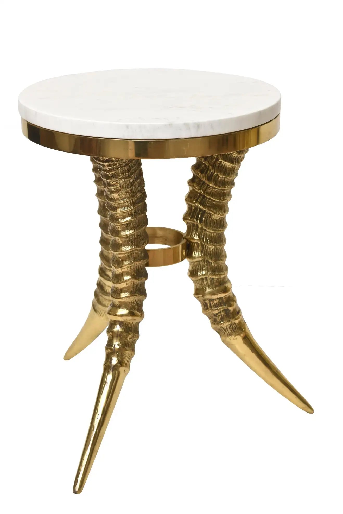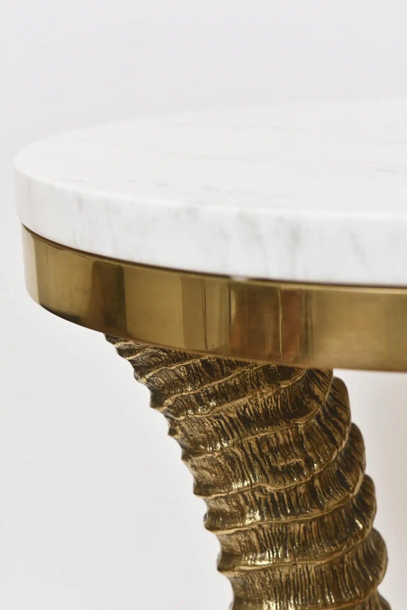 This fantastic marble and brass horn side or drink table with a marble top is tres chic! The marble top was replaced and is called Volakas marble from Greece. It has beautiful veining of grey and champagne with white. It is sculptural and unusual side table with good weight. The curved horn shaped 3 legs add great dimension and are textural. They are held together with a brass ring. This can go into any decor and room for a conversation addition. It is very well made and from the 1970s. The depth of the curved table legs from front to back is 17.5″.