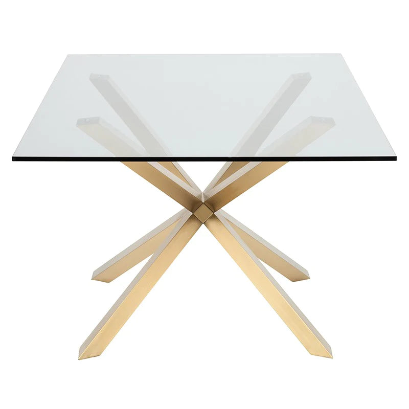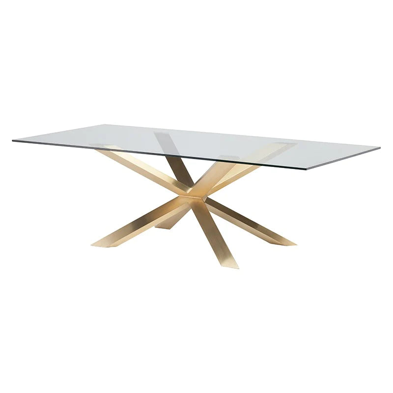 Modern dining table with stainless steel metal base with asterisk shape in brushed gold colour and smoked glass top, with four legs supporting. This dining table is Ideal for a modern and stylish dining room or conference place. Suitable for both residential and commercial use.