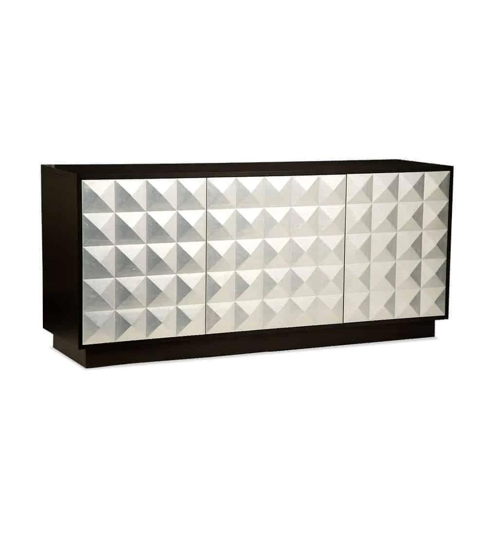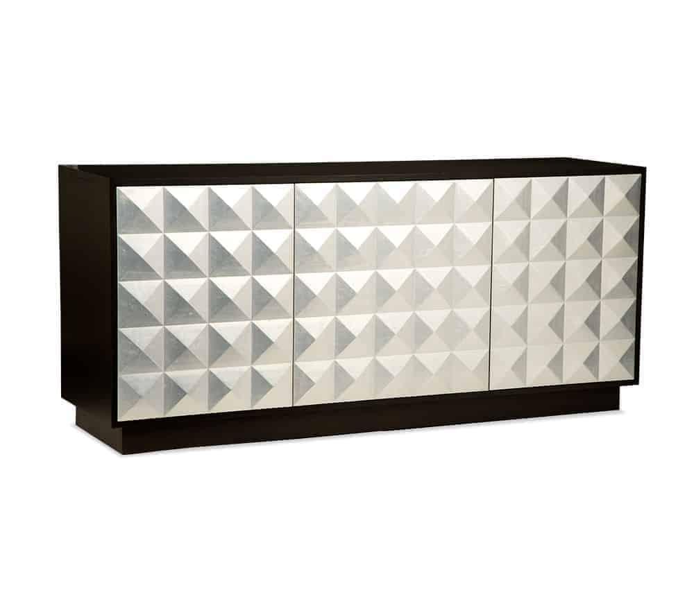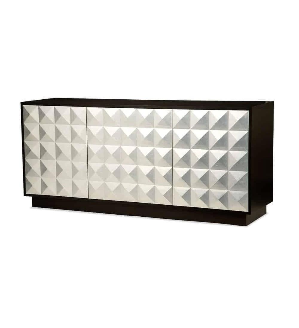 The Waldorf buffet is a storage piece and a work of art. Crafted of solid timber, the case is finished in brushed nickel metal, while its doors feature a geometric pyramid pattern that lends texture and subtle depth. The table’s contrast of nickel metal on black oak adds a cool contemporary vibe to any living room.