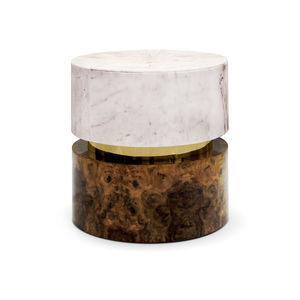 The Waldorf Contemporary Marble Brass Walnut Designer Side Table, stimulate the senses and create a seductive atmosphere with this luxuriously elegant design of refined Art Deco inspiration and fine detail. A unique touch of sophistication and opulence with elegant feminine curves, creating the most expressive of outlines. Original and exquisitely current. Hand-crafted with remarkable attention to detail by Avant Garde master craftsmen. The contrast between white marble, the richness of the Walnut root veneer and vibrant polished brass bringing a strong look to this elegant piece. Designed in a minimal contemporary style making its beautiful radial arrangement of individual marble pieces to the top its defining aspect. Creating a fabulous focus.