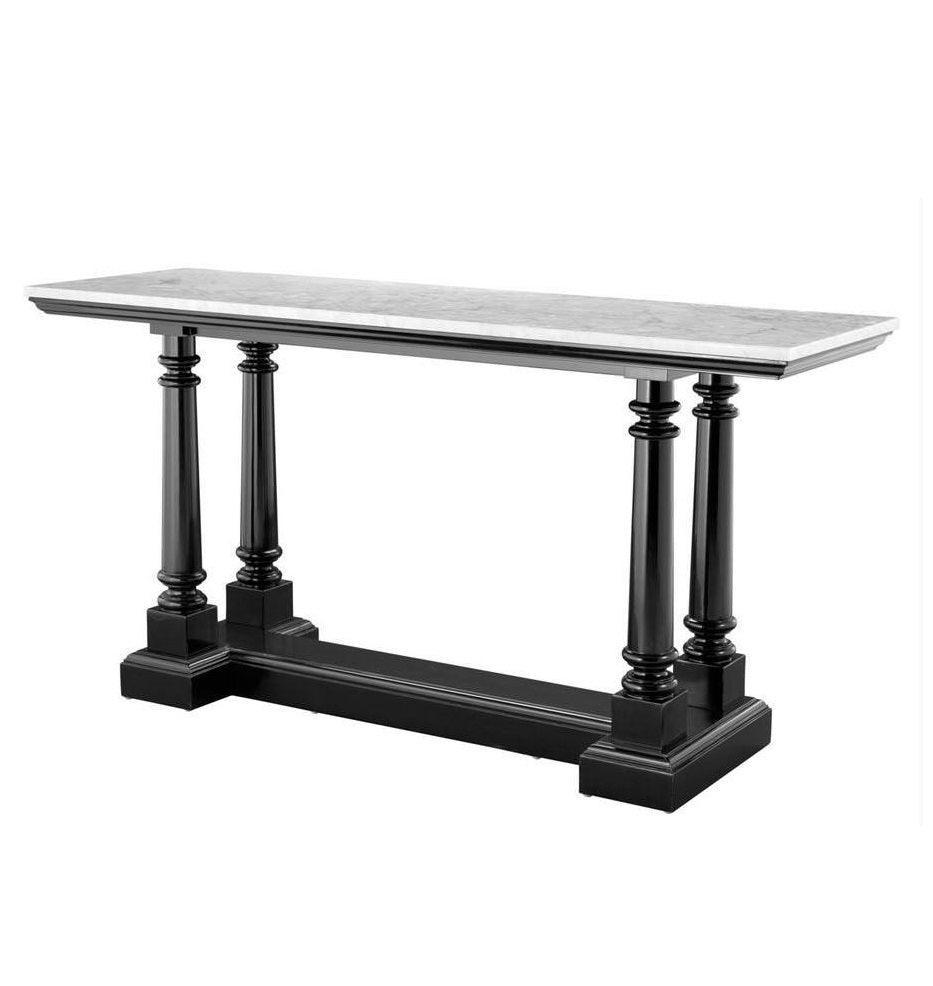 Walford console table in waxed black finish with a white marble top.