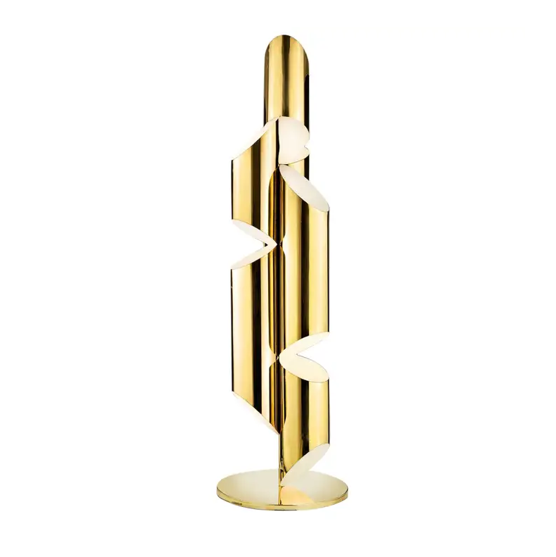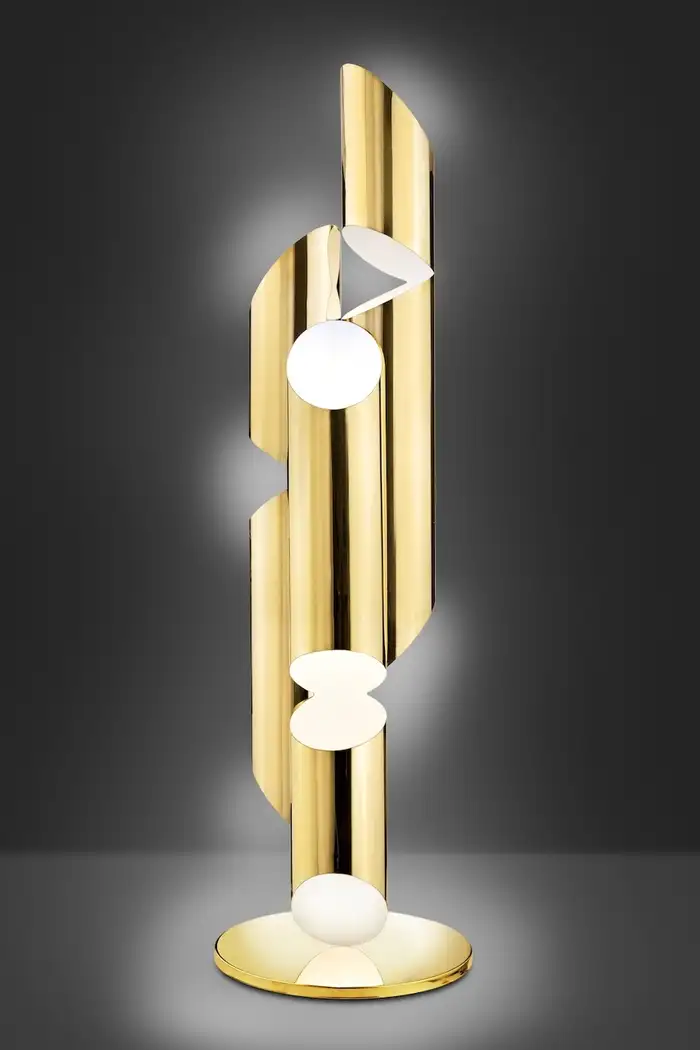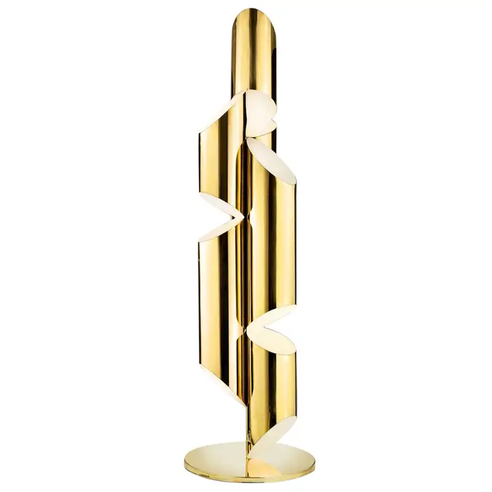 Inspired by the pipes of a church organ, this sculptural floor lamp lamp is crafted from stainless steel in Polished gold finish. Incandescent light fills each pipe and exits through strategically placed slits, creating a warm and inviting ambiance.