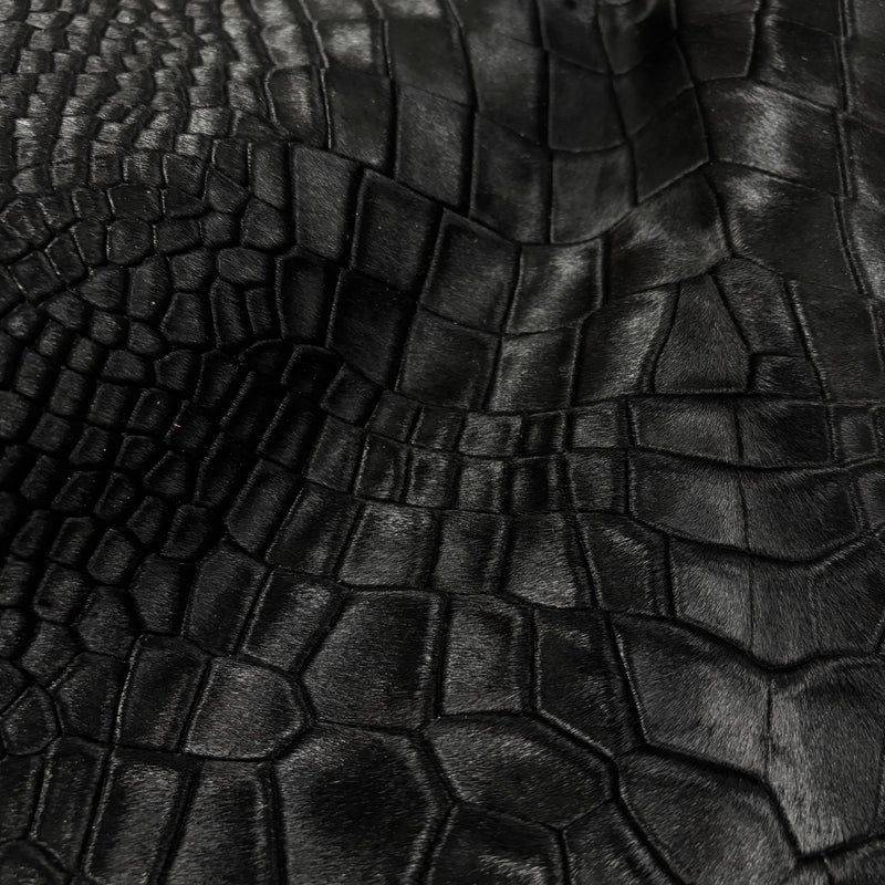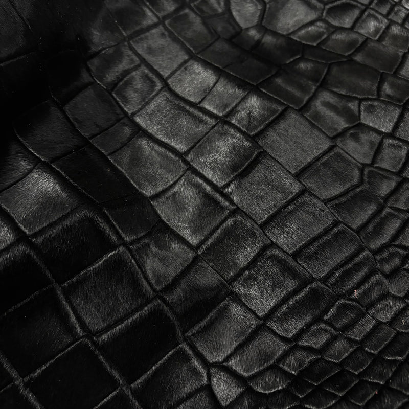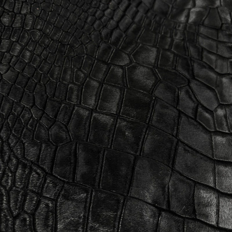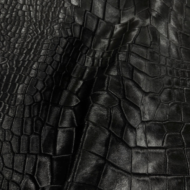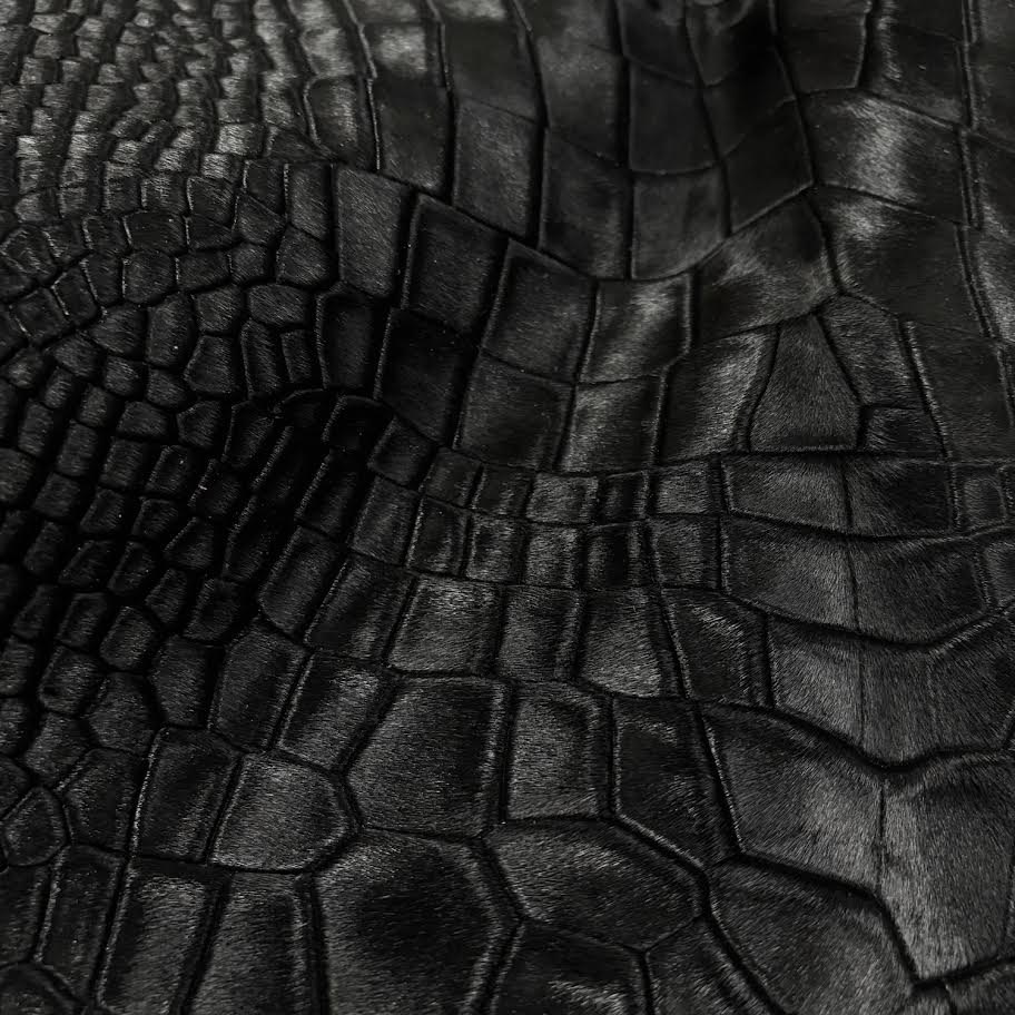 Cavalino or hair-on calf is one of the most luxurious and elegant leather materials produced. The hair is sheared to a short length making the skins very supple and ideal for apparel. Utilized throughout the world by the most high-end designers, Cavalino is a premier leather material which is suitable for making any project pop and adding a touch of high-class while not looking over-the-top or ostentatious. This particular pattern features an eye-catching crocodile print in a classic black colorway.