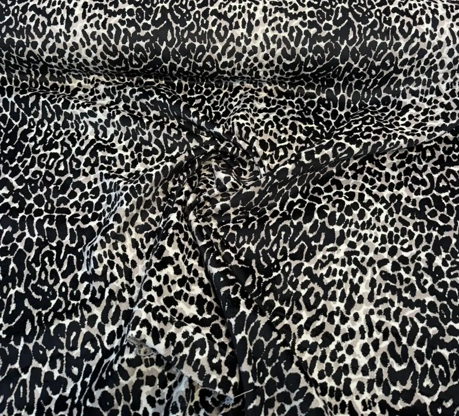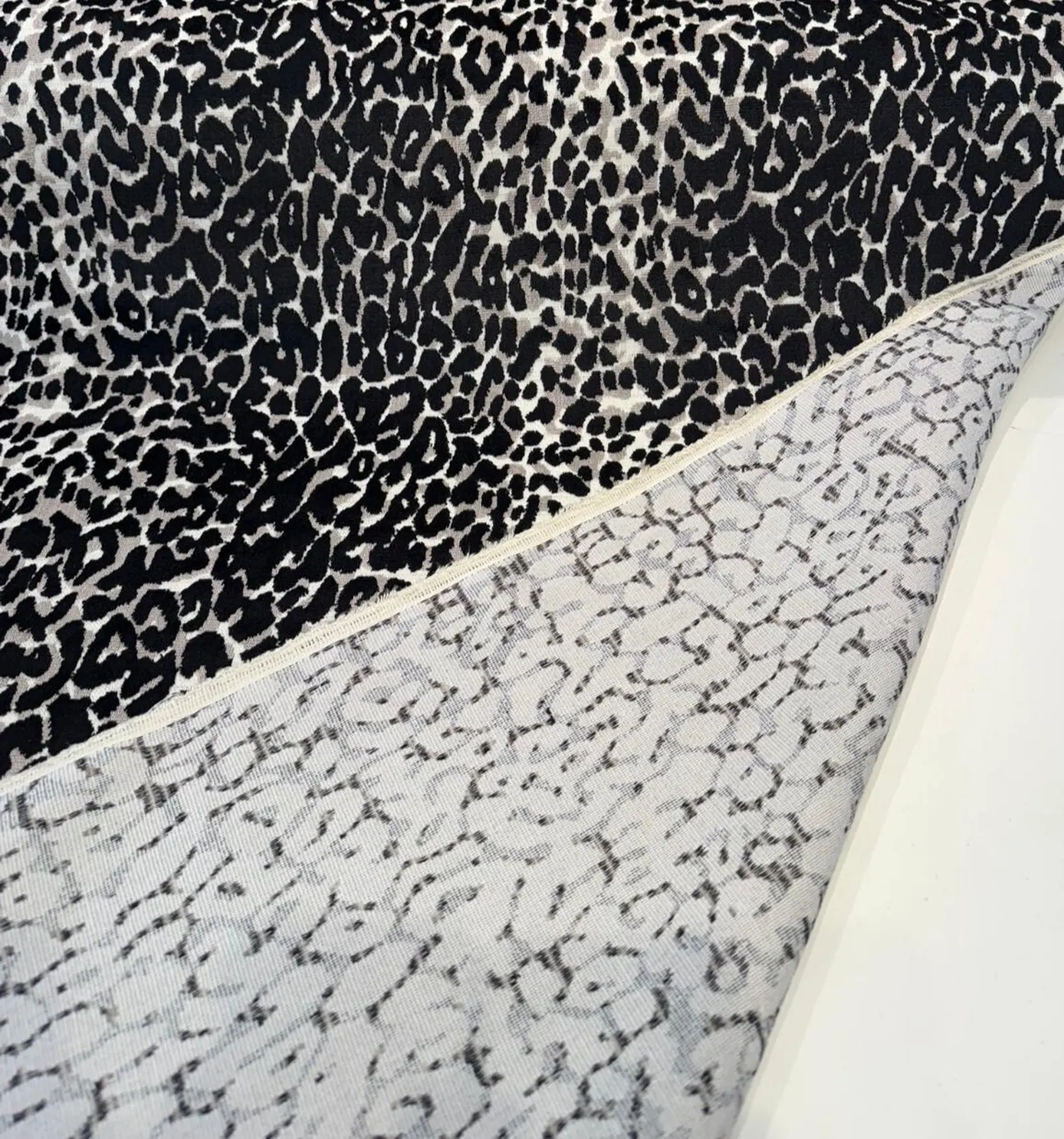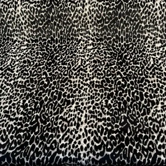 Leopard Onyx Velvet Inspired Upholstery Fabric. Make a bold design statement with Velvet Onyx, a luxurious leopard-inspired velvet fabric in rich black and cream tones. Woven with a blend of viscose and polyester, this fabric offers both a soft hand and elevated durability—perfect for high-impact upholstery applications. The large-scale repeat (25″ vertical x 14″ horizontal) gives the pattern room to breathe, making it ideal for dramatic chairs, sofas, headboards, and statement pillows.