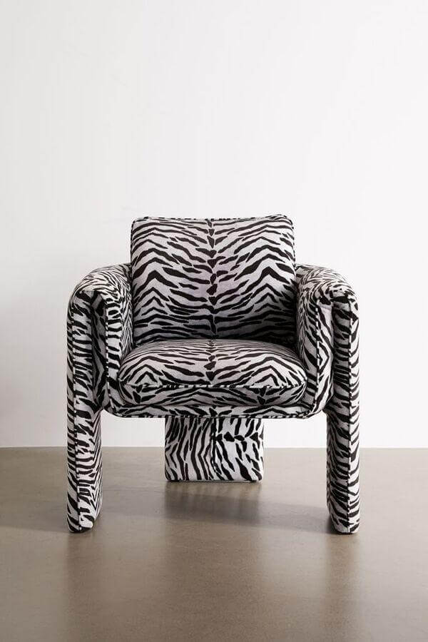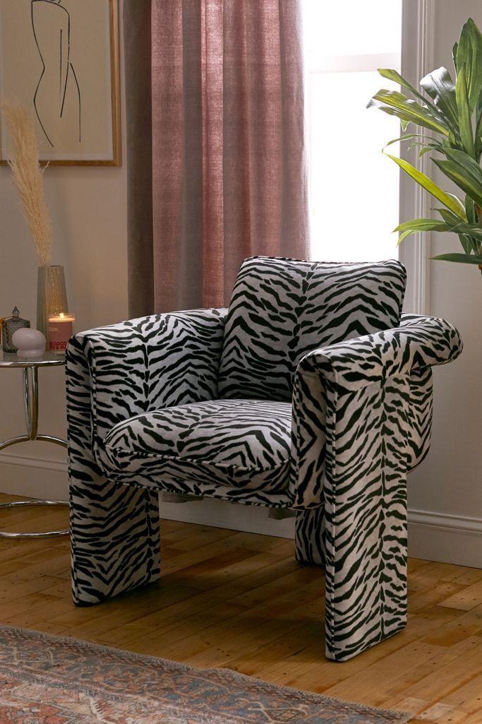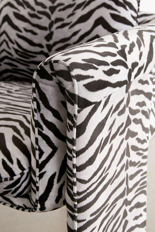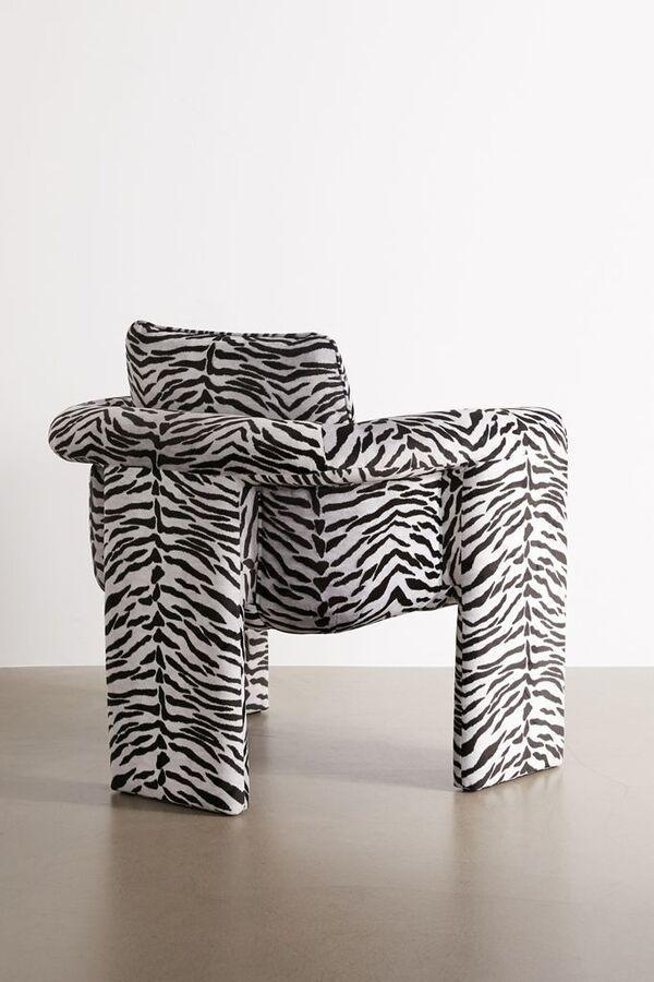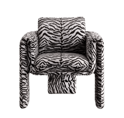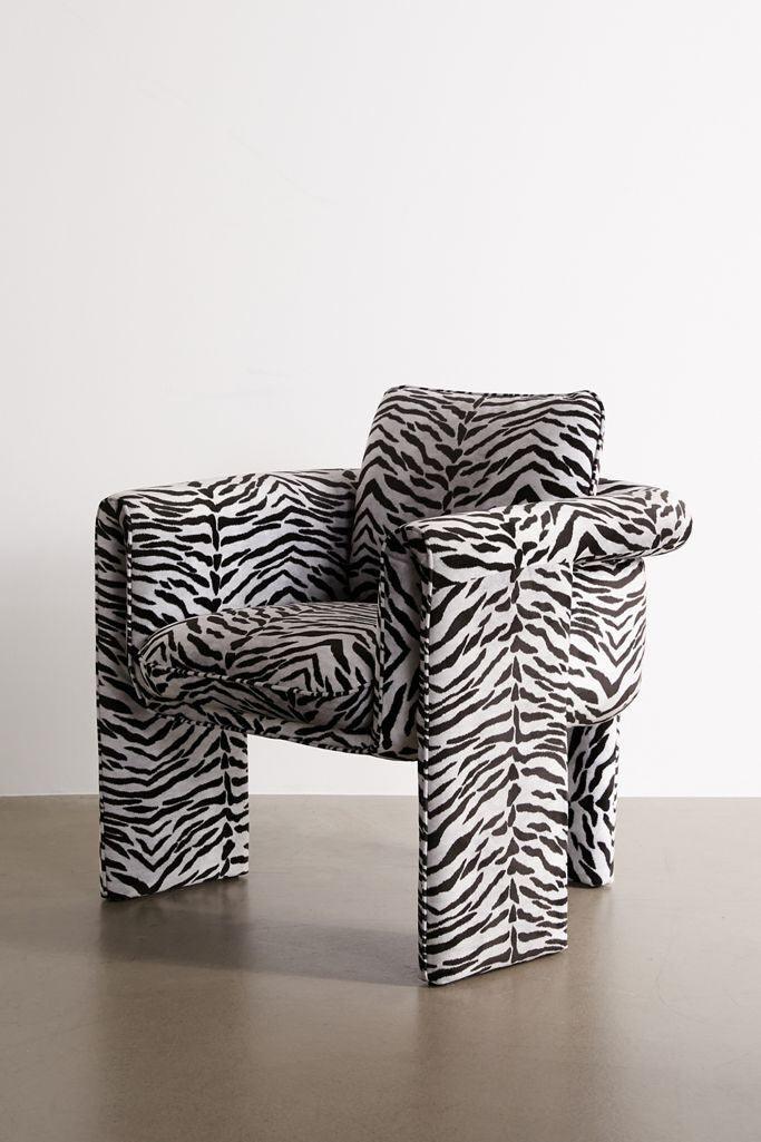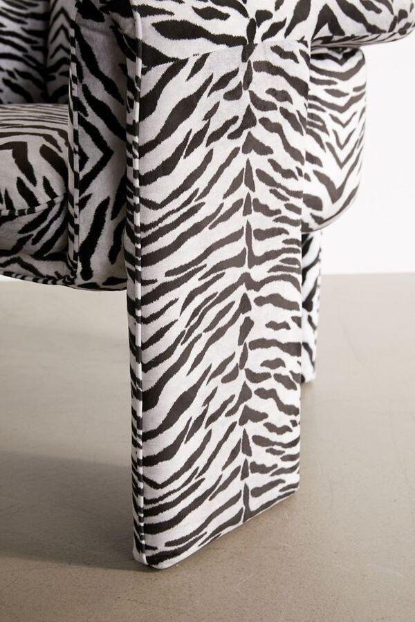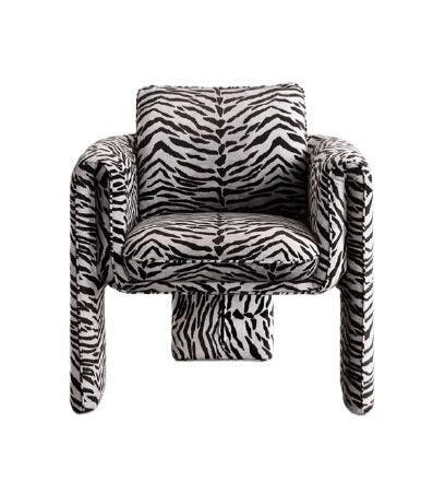 Xavier Zebra Fabric Armchair. Upholstered allover in rich velvet, this arm chair lends a luxurious interpretation of modernist silhouettes to your space. Tri-leg chair features cushions at seat and back, set on a wrapped and folded structure that feels so fresh and unexpected.