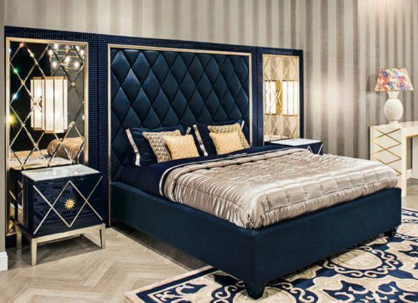High End Modern Velvet Mirror Storage Bed. Luxurious designed High gloss metal finished edge to the headboard frame and upholstered in velvet fabric. The Mattress base lifts up to reveal large storage space with the use of gas struts. Available with the extending engraved mirrored headboard panels with Gold details and integrated wall sconce as shown, and in various colours, finishes and alternative sizes.