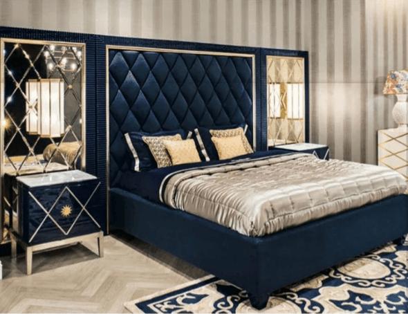 High End Modern Velvet Mirror Storage Bed. Luxurious designed High gloss metal finished edge to the headboard frame and upholstered in velvet fabric. The Mattress base lifts up to reveal large storage space with the use of gas struts. Available with the extending engraved mirrored headboard panels with Gold details and integrated wall sconce as shown, and in various colours, finishes and alternative sizes.