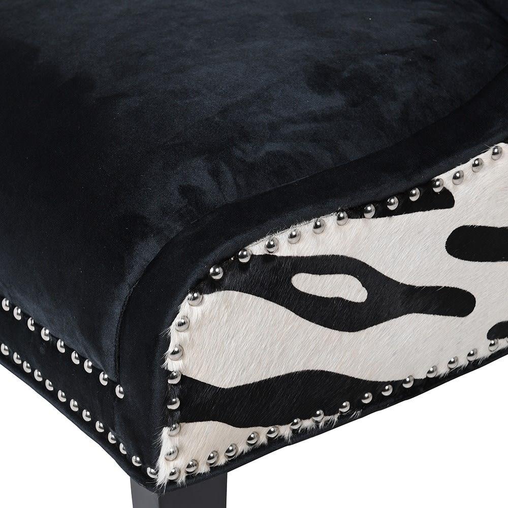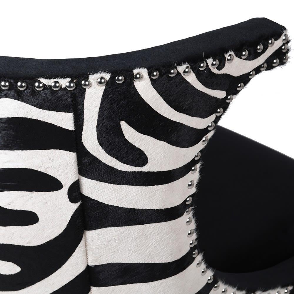 Enhance your home interior with this stunning casual contemporary accent chair. Finished in zebra print cowhide and black velvet with nickel stud detail.
