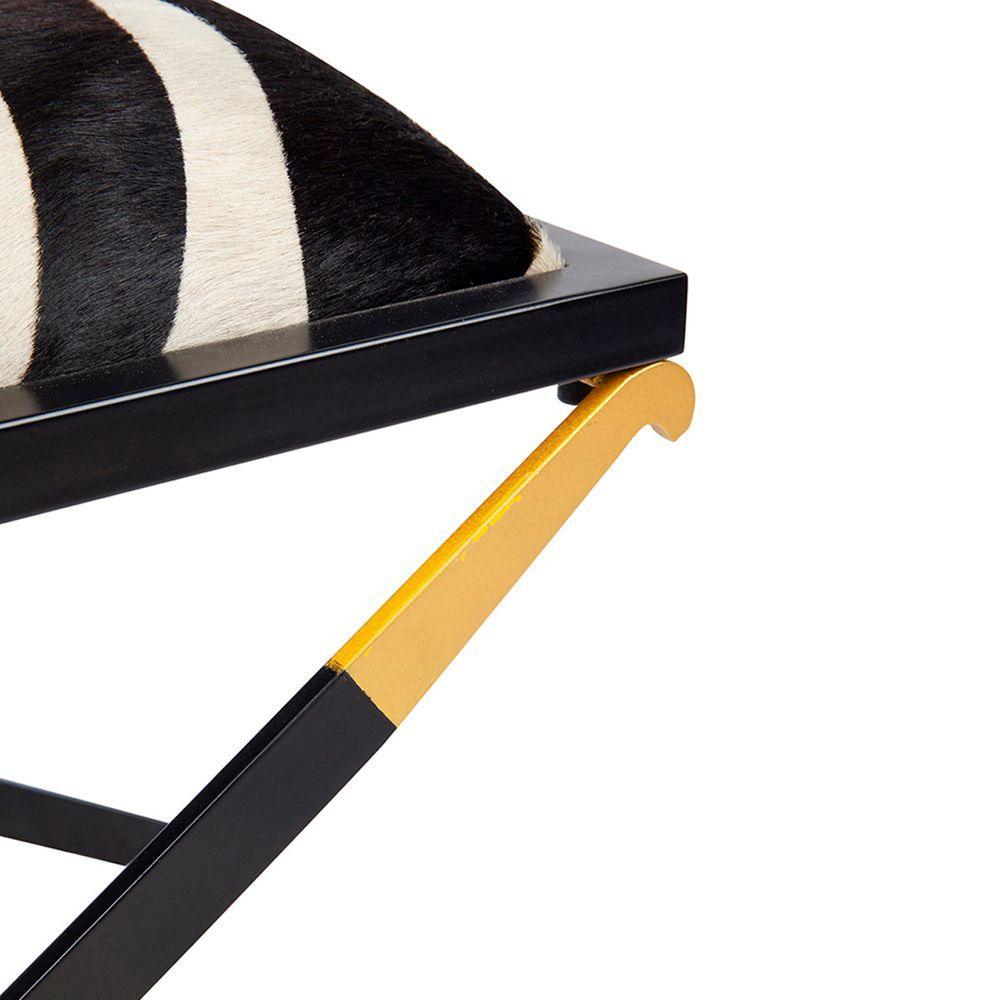 Black and white zebra design stool. Made in 100% genuine cow hide. Black steel cross legs finished with elegant gold tips. No two items will be alike.