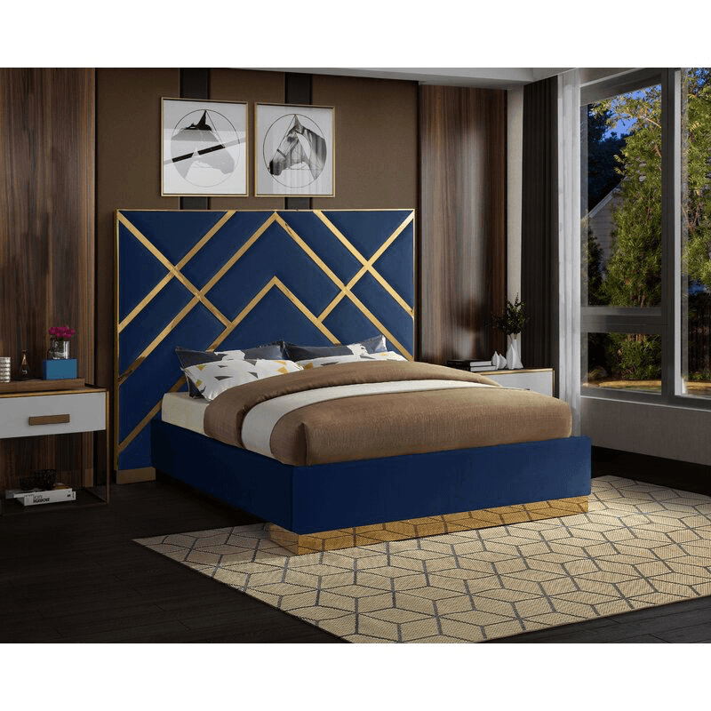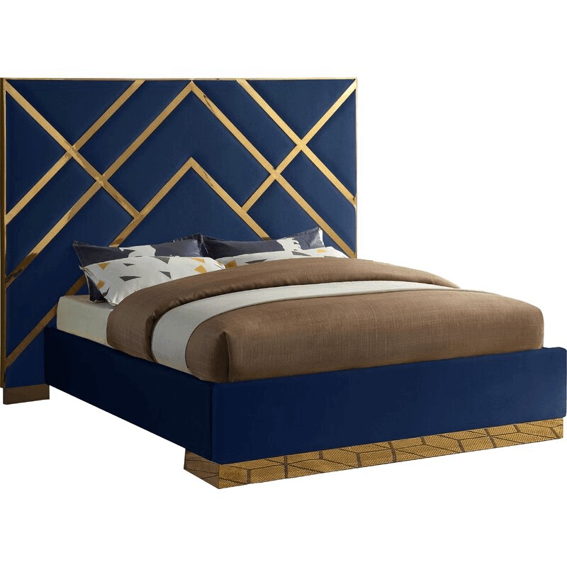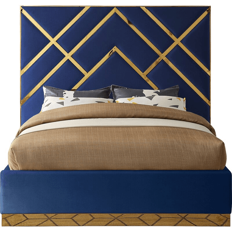 The Zara Collection by Avant Garde Furniture will take your bedroom space to a whole new modern level of sophistication and style. This Zara velvet queen features posh velvet upholstery in a lovely Navy colour that is intersected by polished gold metal in a geometric design that is nothing short of spectacular. This stunning bed has a gold metal base to finish off the presentation on a glamorous and upscale note. Full slats are included with the bed to help provide support for your Queen, King or Super King mattress, and the platform footprint ensures you need no box springs or foundation to recreate this look at home.
